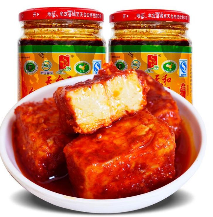 油腐乳,是用优质大豆和天台石羊泉水做成的色鲜味美的鲜豆腐,采用民间传统工艺自然发酵和自然晾晒后,配以辣椒、花椒等多种佐料,再掺入无公害食用菜籽油、辣椒、精制食盐等腌制而成,经六十多道工序精制而成"油腐乳"。