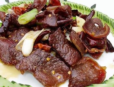再说这吃,高良牛干巴吃法不拘一格,可以炸着吃、煮着吃,还可以用火烧着吃,虽然吃法多,吃起来却不复杂。其中,水煮牛干巴是先将干巴切成薄片,油炸后放入酸笋做好的肉汤里煮10分钟便可食用;而火烧牛干巴则是先将牛肉条放到木炭火灰里将干巴烧熟,取出拍尽灰烬,待牛肉松软后,将干巴撕成肉丝放入盘中,同便蒿、薄荷、辣椒等配料搅拌后就可以了。火烧牛干巴香醇酥脆,是难得的一道好菜,而且袋装后还可以当做零食慢慢享用。